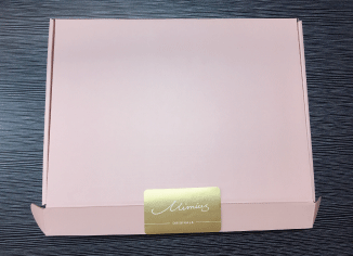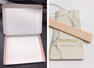 1)粉色包裝盒,灰底白板紙專色印刷,覆上啞膜,再與瓦楞紙對裱,模切成的飛機(jī)盒。顏色粉嫩,與女裝主題相符,加上專色金絲網(wǎng)印刷的標(biāo)簽,搭配完美!厚度挺度自然不用說,直接可當(dāng)快遞盒使用,到顧客手里也是完好無損。