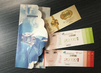 1)花型的邀請(qǐng)函,采用的是進(jìn)口藝術(shù)紙,四色印刷后過(guò)啞油,開(kāi)模切成型的單張優(yōu)惠券也是進(jìn)口藝術(shù)紙印刷,燙金,打齒線,明快的色彩增色不少!
